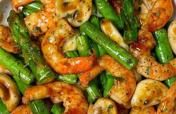 食材準備:口蘑、蘆筍、大蝦、薑絲、蒜米、黑胡椒、歐芹碎。