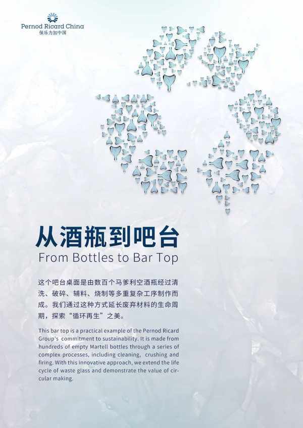 延續一貫的綠色展位理念,保樂力加在吧臺設計中融入環保細節,使用數百個馬爹利空瓶經過清洗、破碎、輔料、燒制等多重復雜工序制作而成,營造瞭一個綠色低碳的體驗空間,與消費者共探循環再生之美。