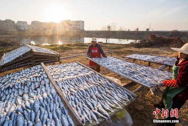 漁民將新鮮白魚、頜針魚、鳳尾魚等水產品進行晾曬。傅建斌 攝