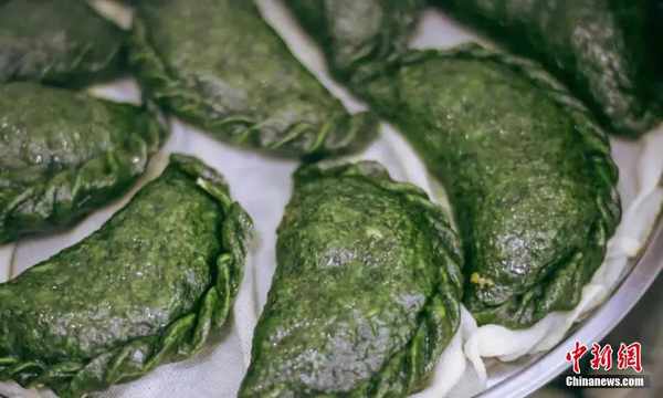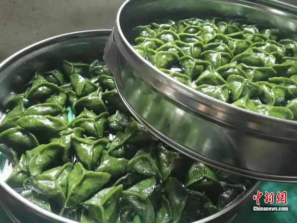 制作好的艾米果。艾米果色澤翠綠,表皮光滑,包入各種餡料後的艾米果如餃子一般,輕咬一口,滿口留香,風味獨特。