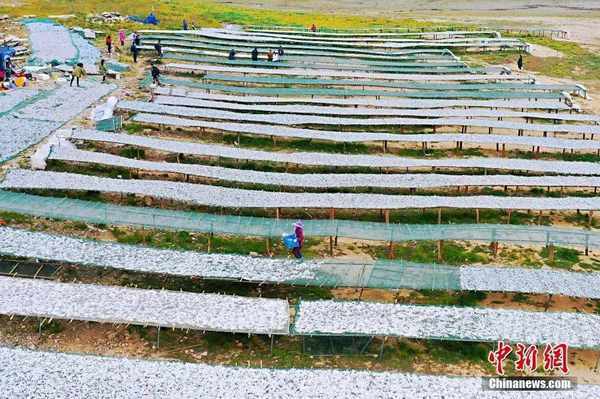 航拍下的漁民晾曬魚幹畫面。劉占昆 攝