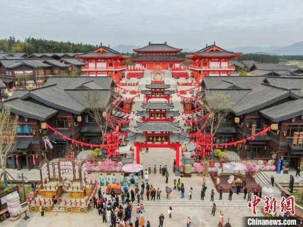 圖為航拍江西景德鎮古色古香的大唐茶市小鎮,眾多遊客在觀看表演。 劉力鑫 攝