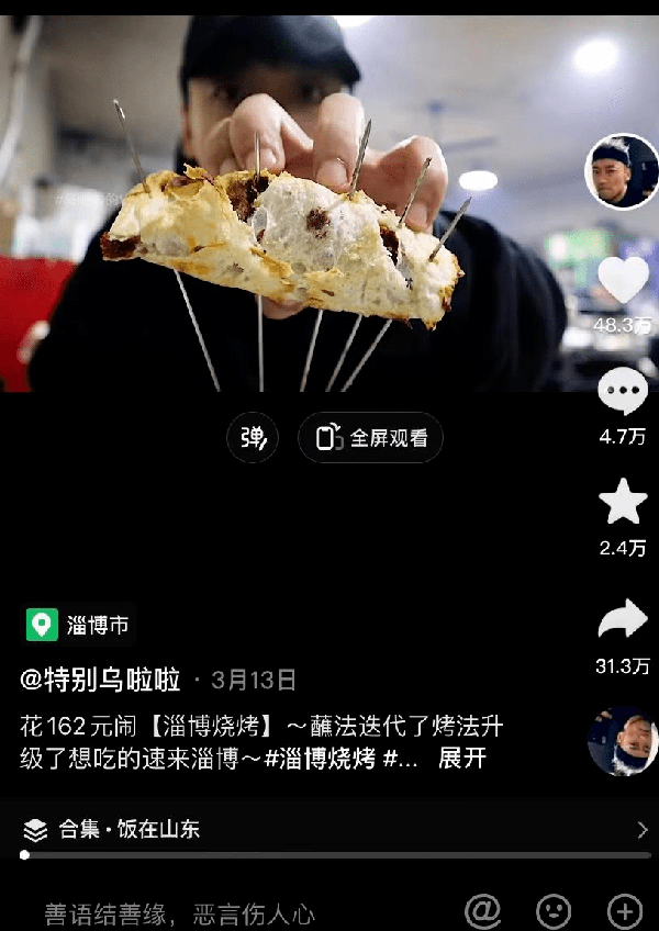 “特別烏啦啦”3月13日在抖音發佈的關於淄博燒烤的視頻就收獲瞭近50萬人的點贊。“淄博燒烤炸裂整個燒烤界”“淄博燒烤有多火”“山東燒烤三大門派”等話題開始相繼登上熱點話題。