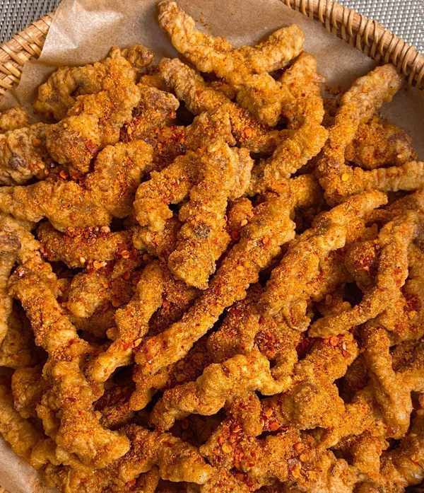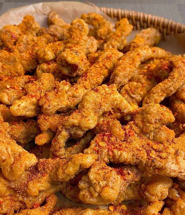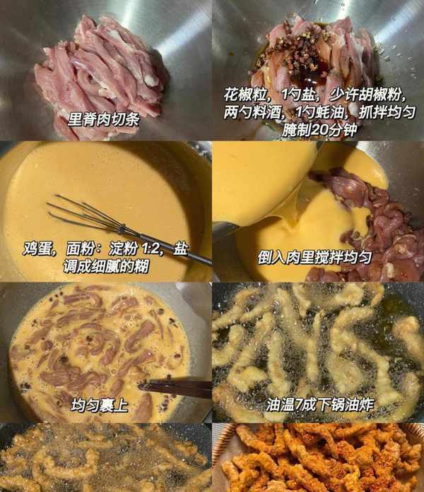 接下來,讓我們來看看小酥肉的制作步驟。首先,將豬裡脊肉切成條狀,加入花椒粒、鹽、胡椒、蠔油和料酒等調味料,攪拌均勻醃制20分鐘。然後,將面粉和淀粉按1:2的比例調成糊狀,加入雞蛋攪拌均勻,制成面糊。接著,將醃好的豬肉均勻地裹上面糊。最後,將油燒至七成熱,將裹好面糊的豬肉放入油中炸至金黃色,撈出後再進行復炸,炸至酥脆。最後,撒上辣椒面、孜然粉、椒鹽或者直接撒上超市買好的燒烤料,即可享用美味的小酥肉瞭。