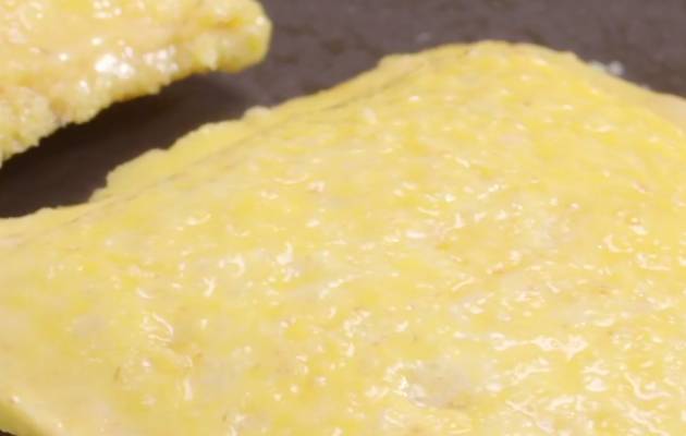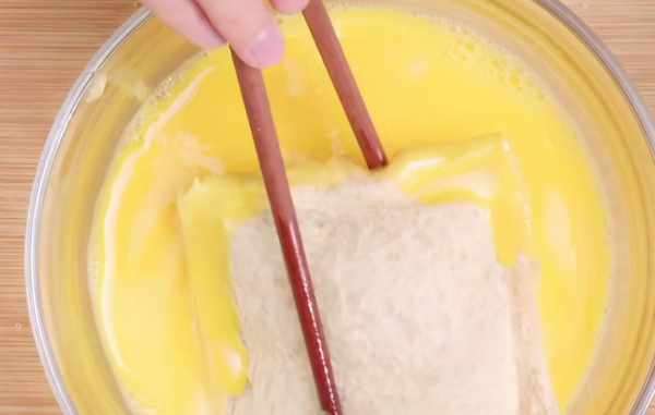 第四步:把處理好的三明治放入裝有蛋液的碗中均勻裹制。