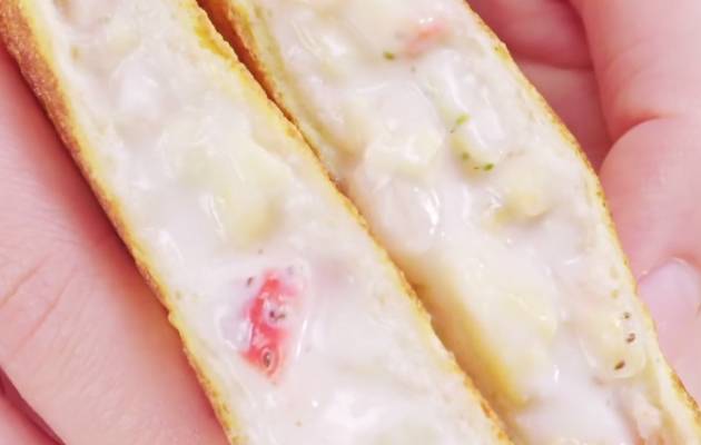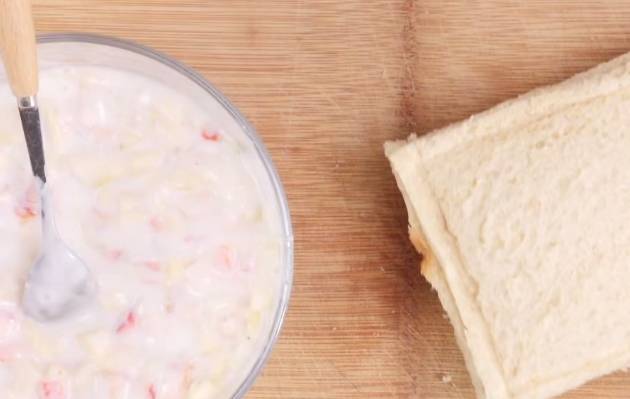 第三步:之後用兩片吐司包裹住準備好的酸奶水果丁,然後用菜刀的刀背把吐司面包的四邊按壓緊實。