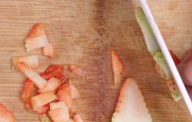 第一步:首先把香蕉去皮,草莓去蒂清洗幹凈,然後分別切成碎丁備用;把吐司面包的四周硬邊切除;雞蛋打散於碗中備用。
