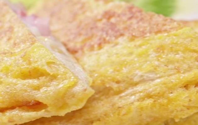 第五步:最後在平底鍋中刷一層食用油,5成油溫放入裹滿蛋液的三明治,然後開中火慢慢煎至雙面金黃微焦,就可以出鍋品嘗瞭。相對於煎制的環節,因為所有的材料之中也隻有蛋液不能生吃,所以煎制的時間不會太長,一般控制在四分鐘左右即可。