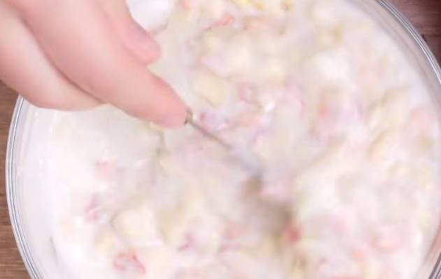 第二步:準備一個碗,在碗中加入草莓丁,香蕉丁,酸奶,用勺子均勻攪拌融合。