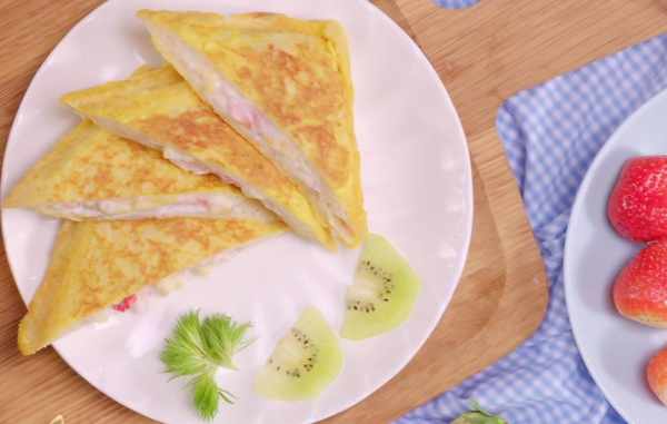 【準備原料】:吐司面包8片,新鮮的草莓8個,香蕉1根,酸奶250ml,雞蛋3個。
