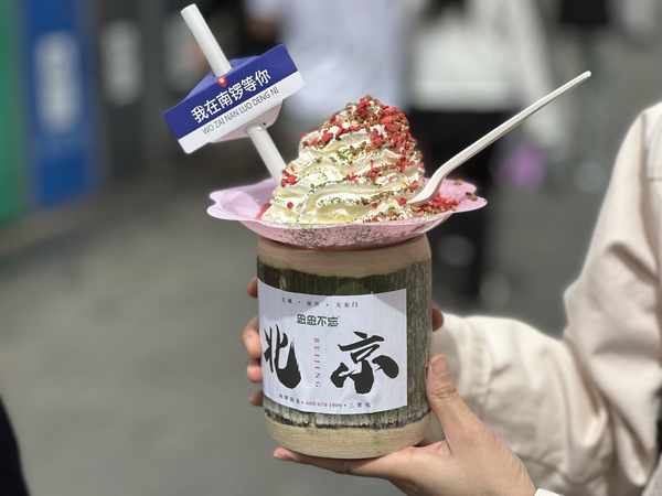 在南鑼鼓巷,新京報記者購買瞭一份竹筒奶茶。在問明所選口味後,另一店員從背後的操作臺端上一杯提前制作好的奶茶產品,而不是像連鎖新茶飲現制現售。隨後,店員開始向竹筒上擠奶油雪頂,再撒上一層抹茶粉,點綴一些草莓果幹、堅果碎,插上帶有“我在南鑼等你”字樣的吸管與勺子,一份成品竹筒奶茶便制作完成,操作時間不超過1分鐘。