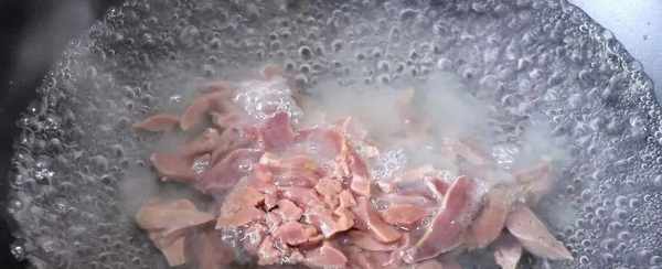步驟2:將雞肝沖洗幹凈切片,起鍋燒水,加入適量蔥段、薑片、料酒,下入雞肝焯水1分鐘左右,撈出控水分備用。