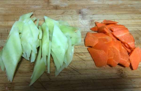 1、萵筍去皮洗凈,先斜切成段,再切成片,這樣就可以切出漂亮的菱形,胡蘿卜也用同樣的方法切菱形。