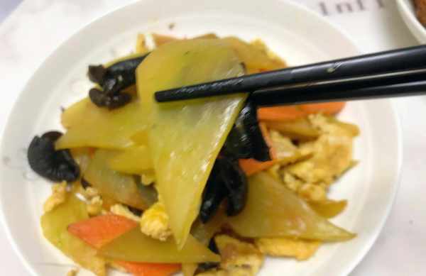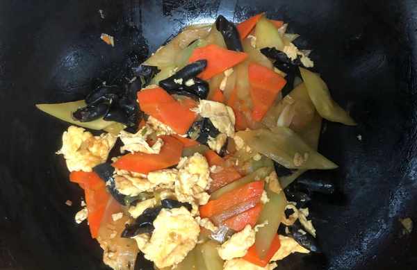 食材:萵筍、雞蛋、胡蘿卜、木耳、蔥、食鹽、十三香