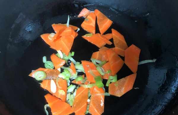 4、加熱鍋中底油,放入切好的蔥花,炒出香味後放入切好的胡蘿卜片翻炒,炒出胡蘿卜中的油脂。
