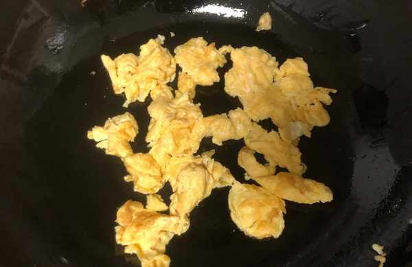 6、最後倒入炒好的雞蛋合炒,出鍋前加入食鹽、十三香調味,翻炒均勻即可出鍋。