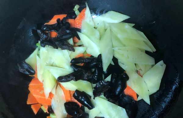 5、接著倒入萵筍片和木耳翻炒片刻,再倒入適量生抽調味,翻炒至萵筍和胡蘿卜斷生。