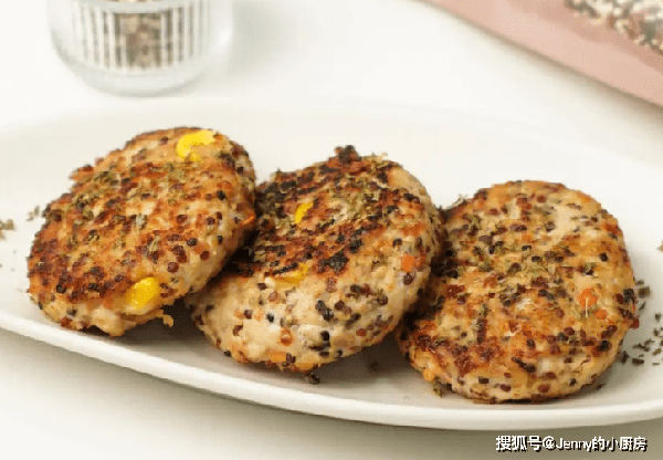 雞胸肉沖洗幹凈,去掉筋膜,放進料理機,打成泥狀。玉米粒或者用別的蔬菜,洗凈煮斷生,再切碎。