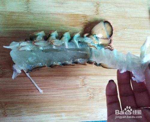 11.龍蝦肉取出後,蝦線就在尾部的頂端。把它拿出來。