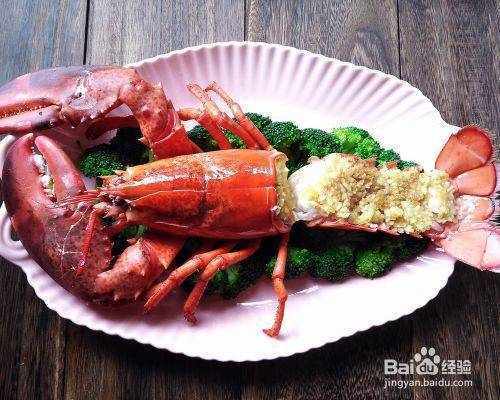 14.把西蘭花放在龍蝦下面,把炒蒜放在龍蝦上,蒸8-10分鐘。