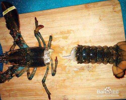 3.用手握住龍蝦的頭和尾,像毛巾一樣將龍蝦的頭和尾朝相反的方向分開。