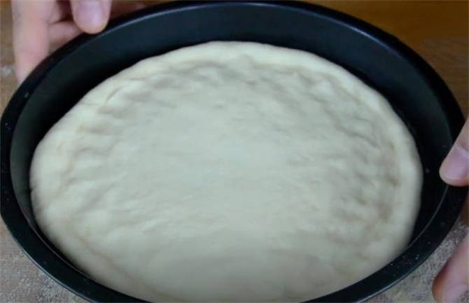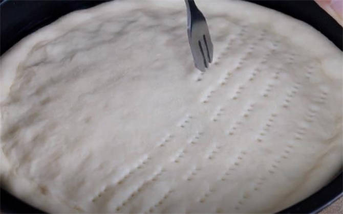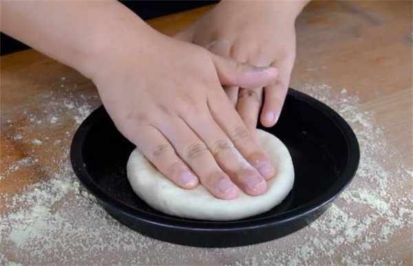 5.餳瞭大概有半個小時,咱們案板上撒一些玉米面,直接用手掌按扁,推成這麼大小的時候,直接放到披薩盤裡面再推。