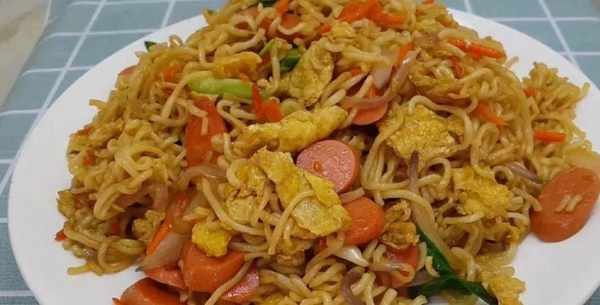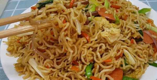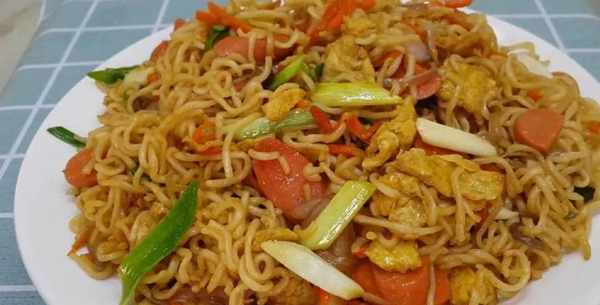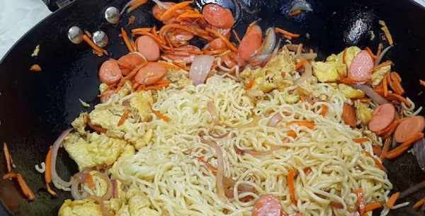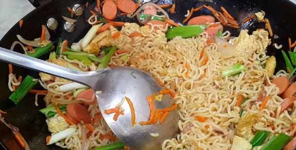 快速翻炒爆香,炒出香味,倒入控水的方便面。