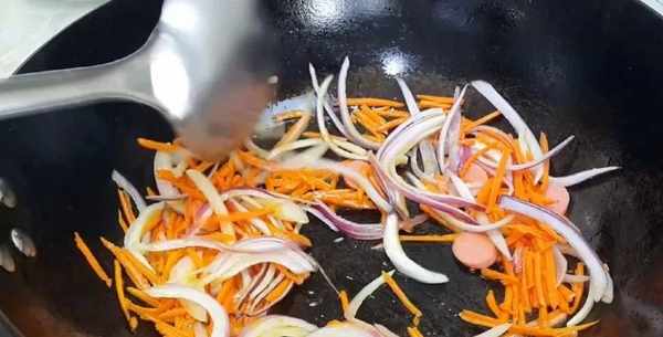 雞蛋撈出裝碗,另起一鍋,下入洋蔥,火腿片,胡蘿卜絲,小火翻炒爆香,炒出胡蘿卜的香味。