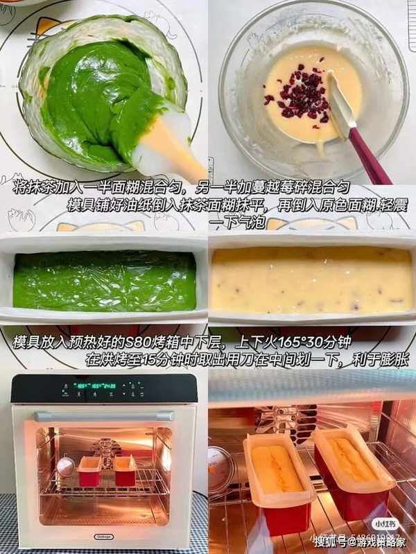 蛋糕糊分成兩份.將抹茶粉加少許玉米油融化,加入一半蛋糕糊中混合勻,另一半蛋糕糊加蔓越莓碎混合.模具鋪好油紙倒入抹茶味抹平,再倒入原味抹平