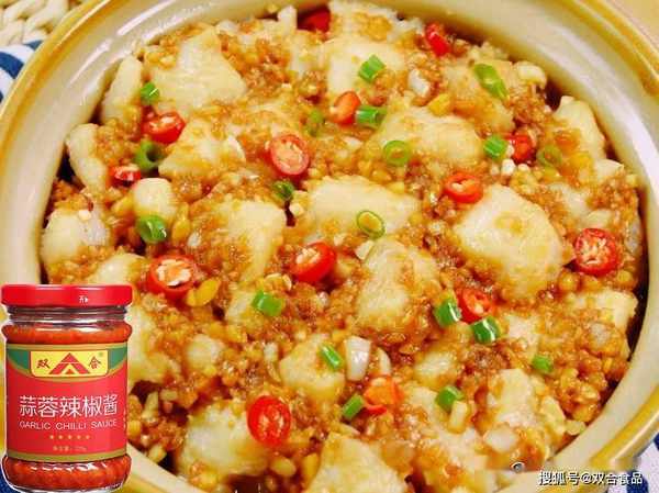 4、出鍋滾油,放進蒜蓉辣椒醬炒出香味,然後加入生抽、耗油翻拌,再淋入龍利魚塊上。