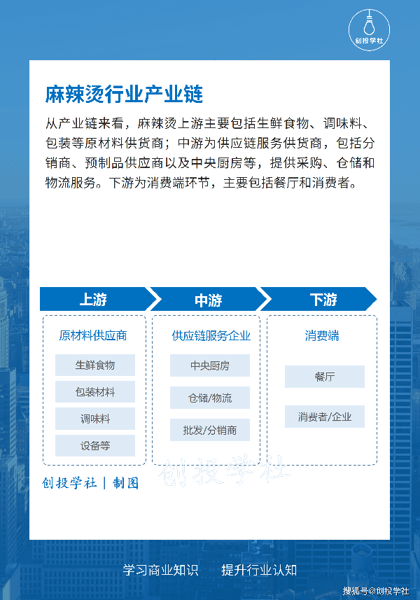 從產業鏈來看,麻辣燙上遊主要包括生鮮食物、調味料、包裝等原材料供貨商;中遊為供應鏈服務供貨商,包括分銷商、預制品供應商以及中央廚房等,提供采購、倉儲和物流服務。下遊為消費端環節,主要包括餐廳和消費者。