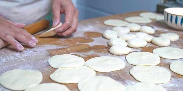 然後把小面團按扁,用搟面杖搟成圓形,做水煎包的皮不能搟得太薄瞭。
