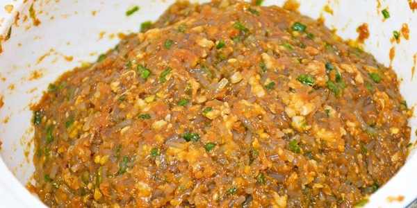 第三步:豬肉餡裡要加入15克的生薑末、再加入香蔥花、雞粉、糖、醬油攪拌均勻,再加入六十克剛剛煮好的香料水,順著同一個方向吧肉餡攪拌好。肉好瞭後才能加入剁碎後的粉條。