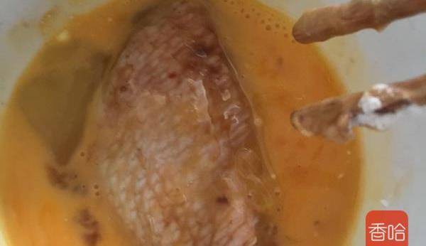3.碗中打一個雞蛋,攪拌均勻,放入雞翅,沾上蛋液!