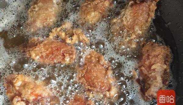 6.鍋中放油,油熱後,開始炸雞翅,小火慢炸,經常翻面,大概7、8分鐘就炸熟瞭!