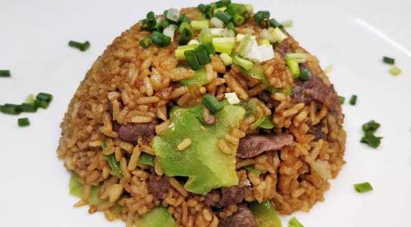 食材:牛肉200克、隔夜米飯750克、苦瓜片適量、雞蛋150克、沙茶、生粉、醬油、胡椒粉、蔥