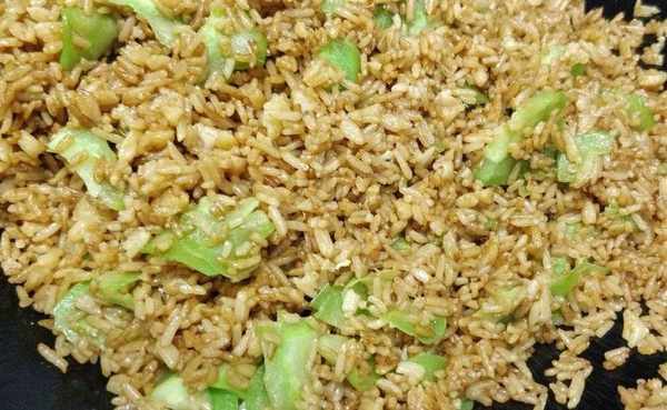 6.加入切成薄片的苦瓜,油膩的飯加上清脆,苦中帶甘的苦瓜,解膩。