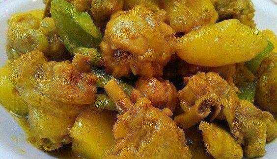 材料: 土豆、雞腿、洋蔥、青椒、幹辣椒、咖喱調、鹽、雞精、白糖