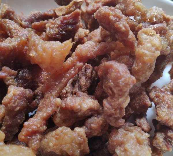6.多炸會兒,炸幹點,肉焦黃,可撈起來。一次性可多炸些,放冰箱,要燒菜,煮面,煮湯之類的放一些,味道很好。(因為主要是用來再煮湯或是炒菜的,所以這裡的肉塊炸的比較的幹。)