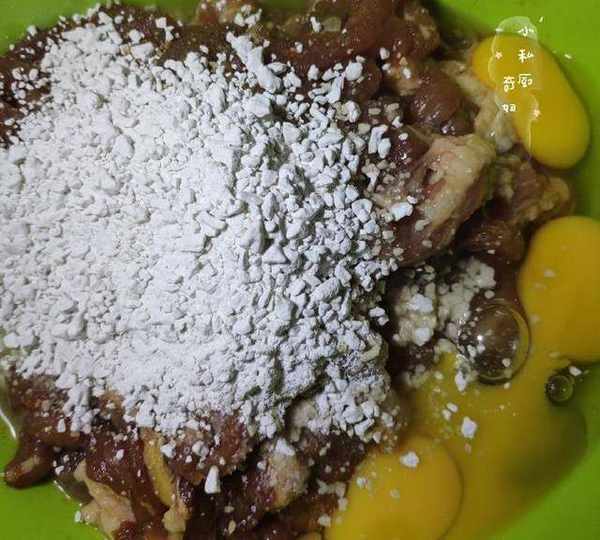 4.然後加進雞蛋,和兩大把的地瓜粉,抓勻,表面有一層薄粉漿即可。