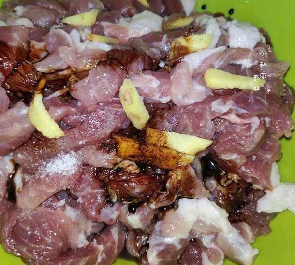 3.往肉裡加薑片,適量鹽,適量醬油,適量五香粉,適量料酒,抓勻,醃制20分鐘左右。(可稍微咸點)