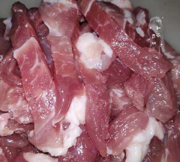2.將豬腿肉切成長條,不要過厚,但也不要太薄瞭。