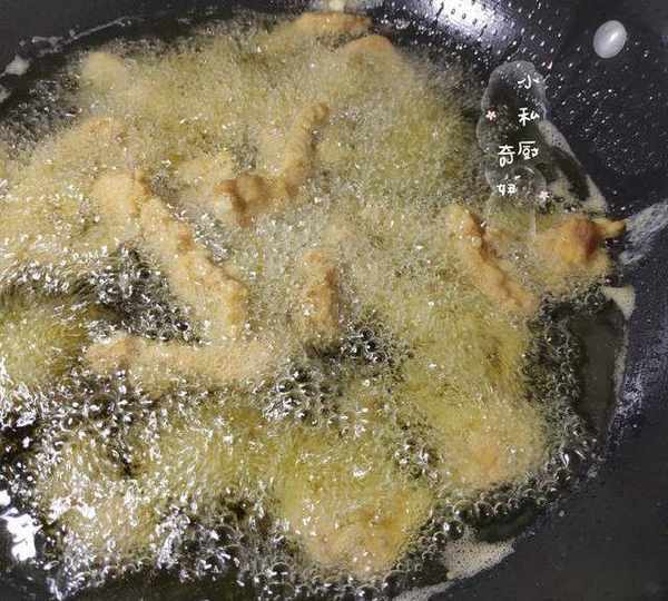 5.起鍋,鍋熱,倒進適量的食用油,中火,油大熱,將裹有粉漿的肉,逐一的放進油鍋裡,進行炸至。