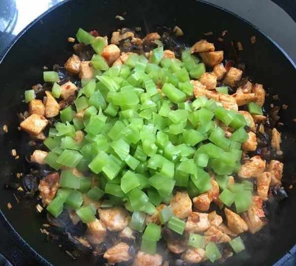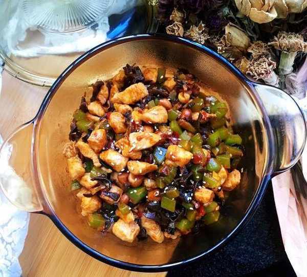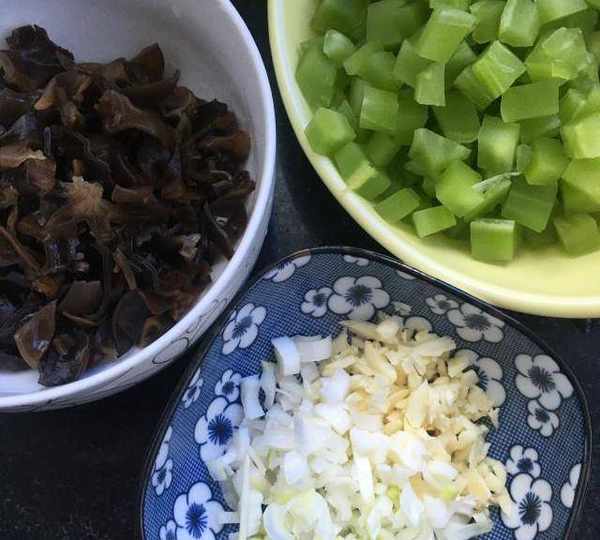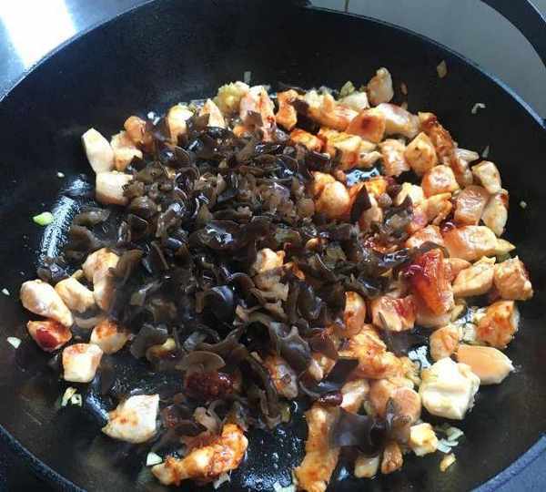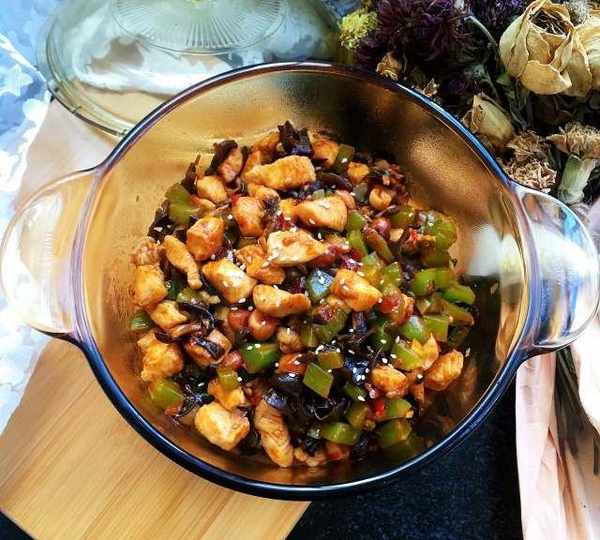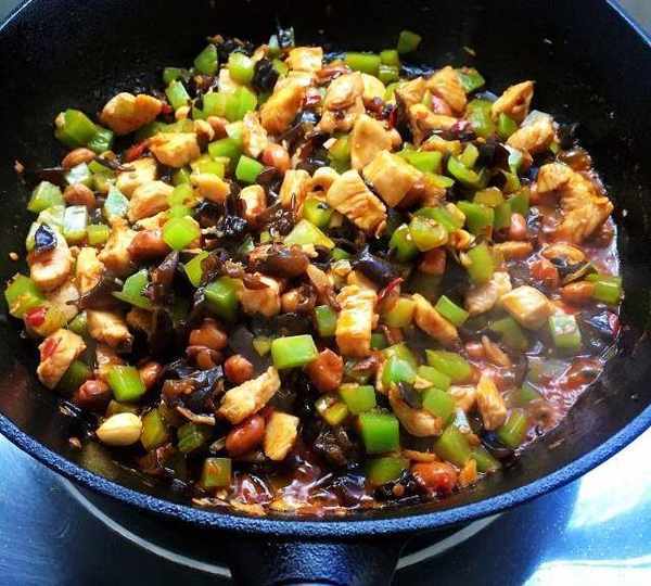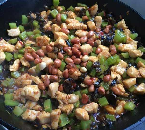 原料:雞胸肉、青筍、木耳、油炸花生、蔥、蒜、油、鹽、豆瓣醬、糖、淀粉、蠔油、醬油、蒜、花椒粉。