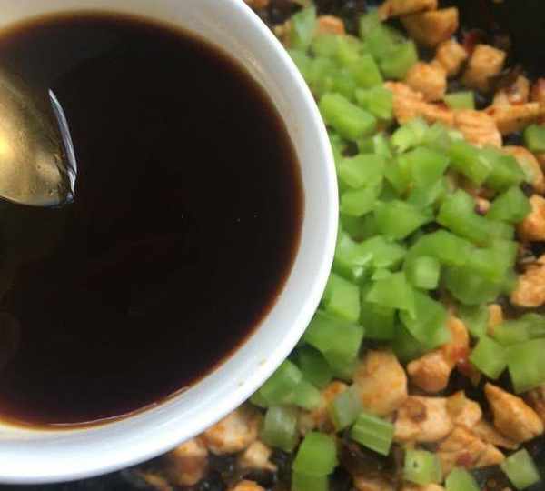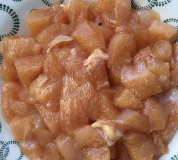 第3步、雞胸肉切丁,加入鹽,料酒,醬油拌均勻。
