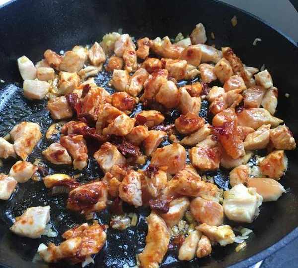 第6步、鍋中入油燒熱倒入蔥蒜爆香,放入雞丁和豆瓣醬炒香。