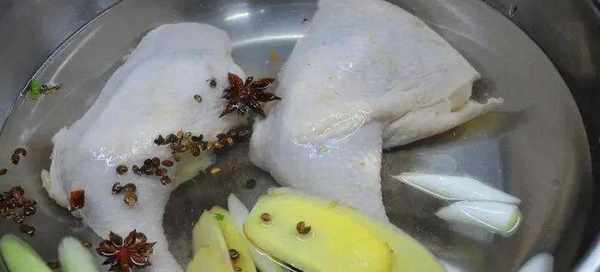 步驟七、關火後加蓋燜5分鐘後撈出,然後迅速放入冰水中冰鎮15分鐘,以便讓雞皮變得爽滑,保證雞腿的原有鮮味不流失;