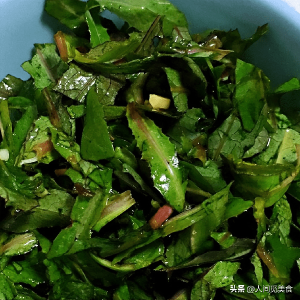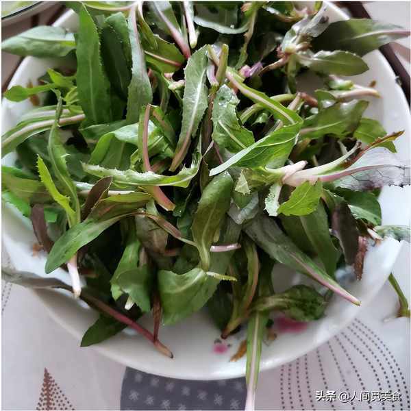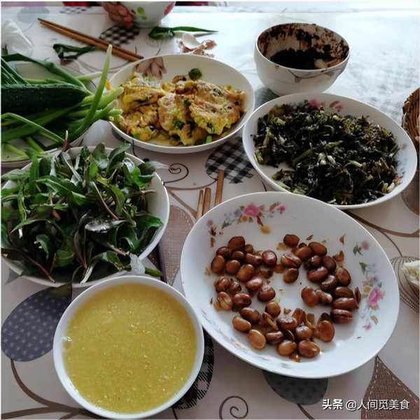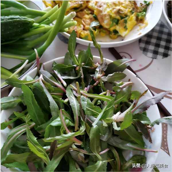 因為婆婆年紀大瞭,牙口不好,不愛吃肉瞭,所以準備的都是婆婆愛吃的東西,像蔥花炒雞蛋、小米粥,還有一盤野菜。這盤野菜來頭可不小,一般都叫它苦苦菜。苦苦菜的葉子多汁而且很嫩爽,用它來做湯有民間第一湯的美譽,吃到嘴裡第一口感是苦,苦之後卻留有甘甜,有點像喝濃茶一樣,吃到最後才感覺到綿長的香味,讓人意猶未盡。