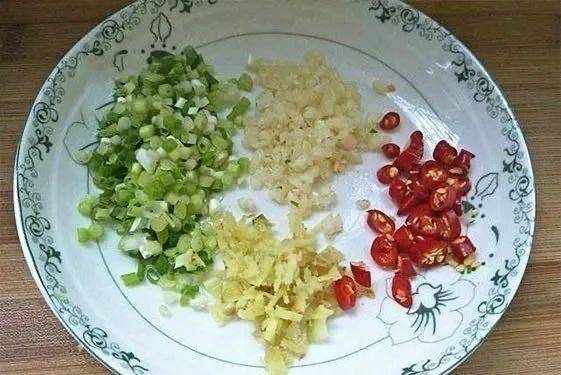 - 第3步,把薑,蔥,蒜,小米辣分別切好,放入盤中備用。