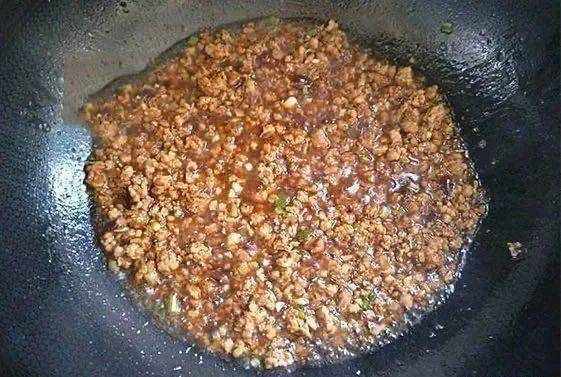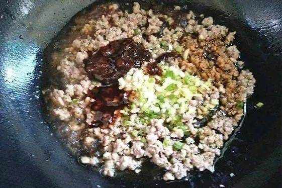 - 第4步,鍋中放入少許油,小火炒肉末,炒至肉末變白,煸炒出油,加蔥薑蒜翻炒幾下,再加入一勺醬油,一勺豆瓣醬,一勺蠔油和一勺料酒炒香。